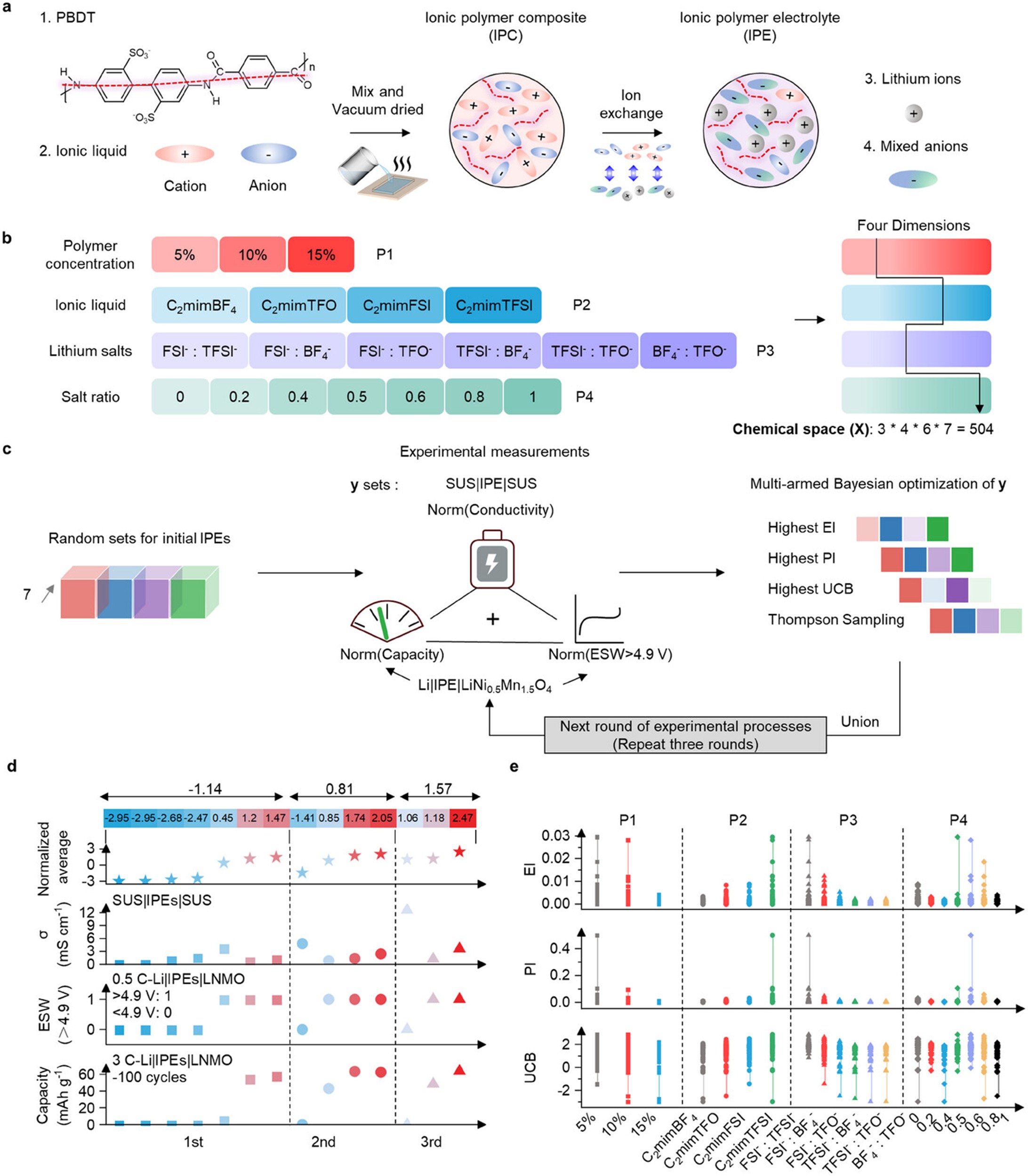 随着便携设备、电动汽车和大规模电网对高能量密度、快速充电电池的需求增长,传统液态电解质因易燃性和高压下的副反应(如界面副反应、气体析出、过渡金属溶解等)受到限制。离子聚合物电解质(IPEs)兼具安全性和界面适应性,但其实现多目标优化(如离子电导率、电化学窗口、循环稳定性)需要在高维化学空间中探索,传统试错法效率低、成本高。此研究展示了高效处理多目标优化的创新方法,为锂电池材料的开发与优化提供了关键见解。