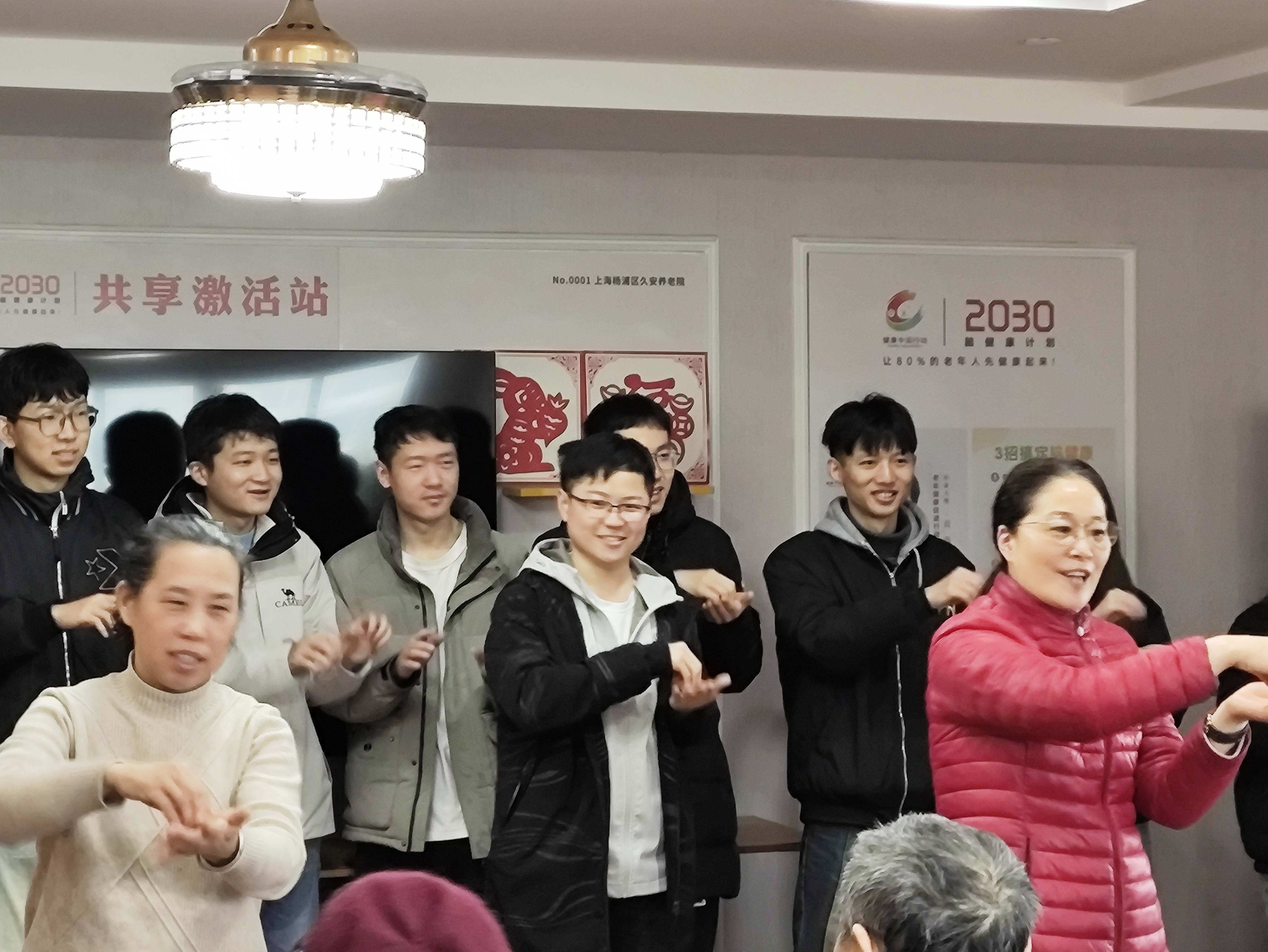 活动的第二个部分是锻炼表演。先是由志愿者们和护工阿姨耐心地为老人讲解手指操的动作要领,再带领爷爷奶奶们在参与中体会简单的手指操,既锻炼了身体,又活动了大脑。同学们与老人们的互动中,给爷爷奶奶带来了愉悦与放松。