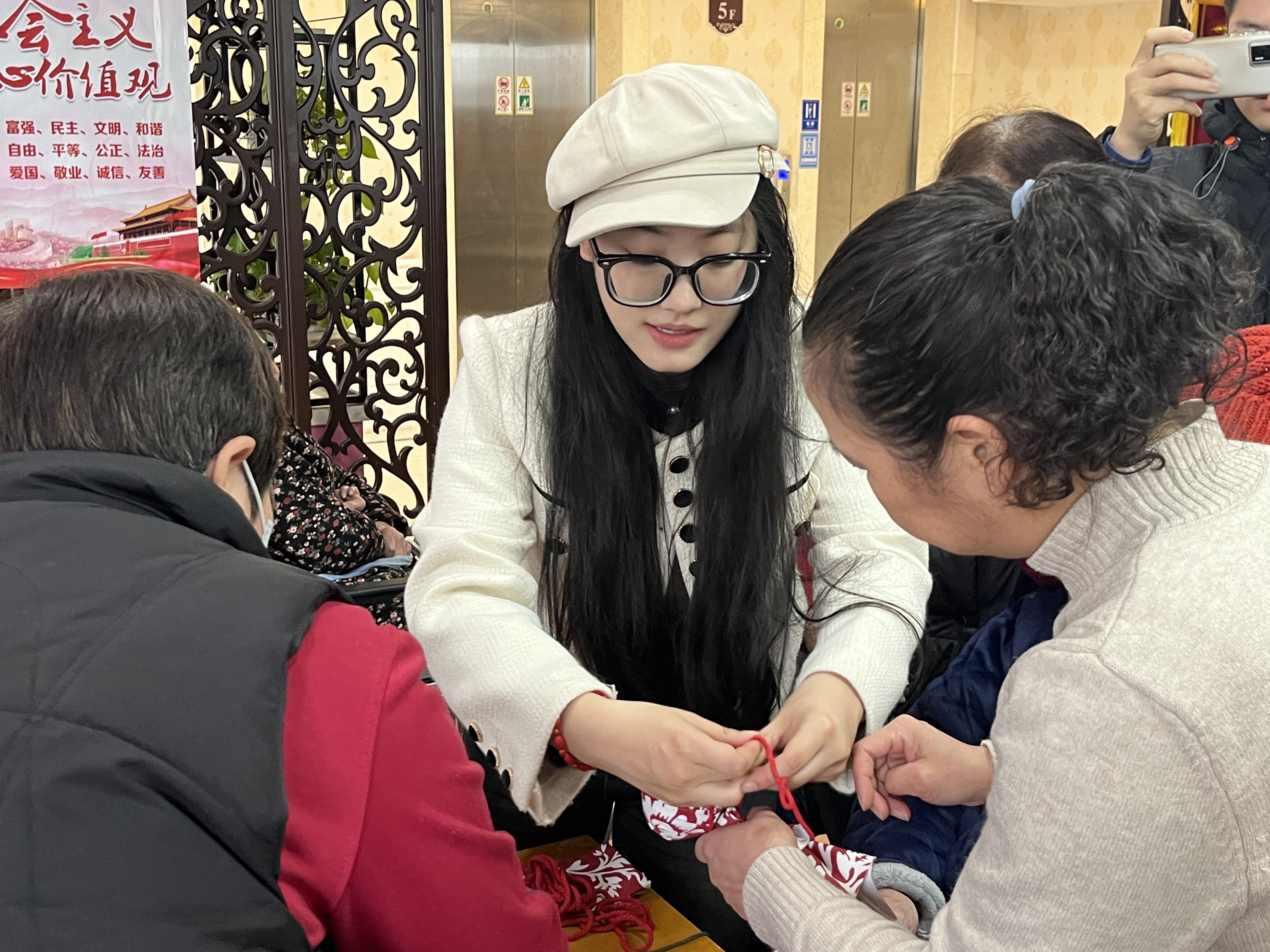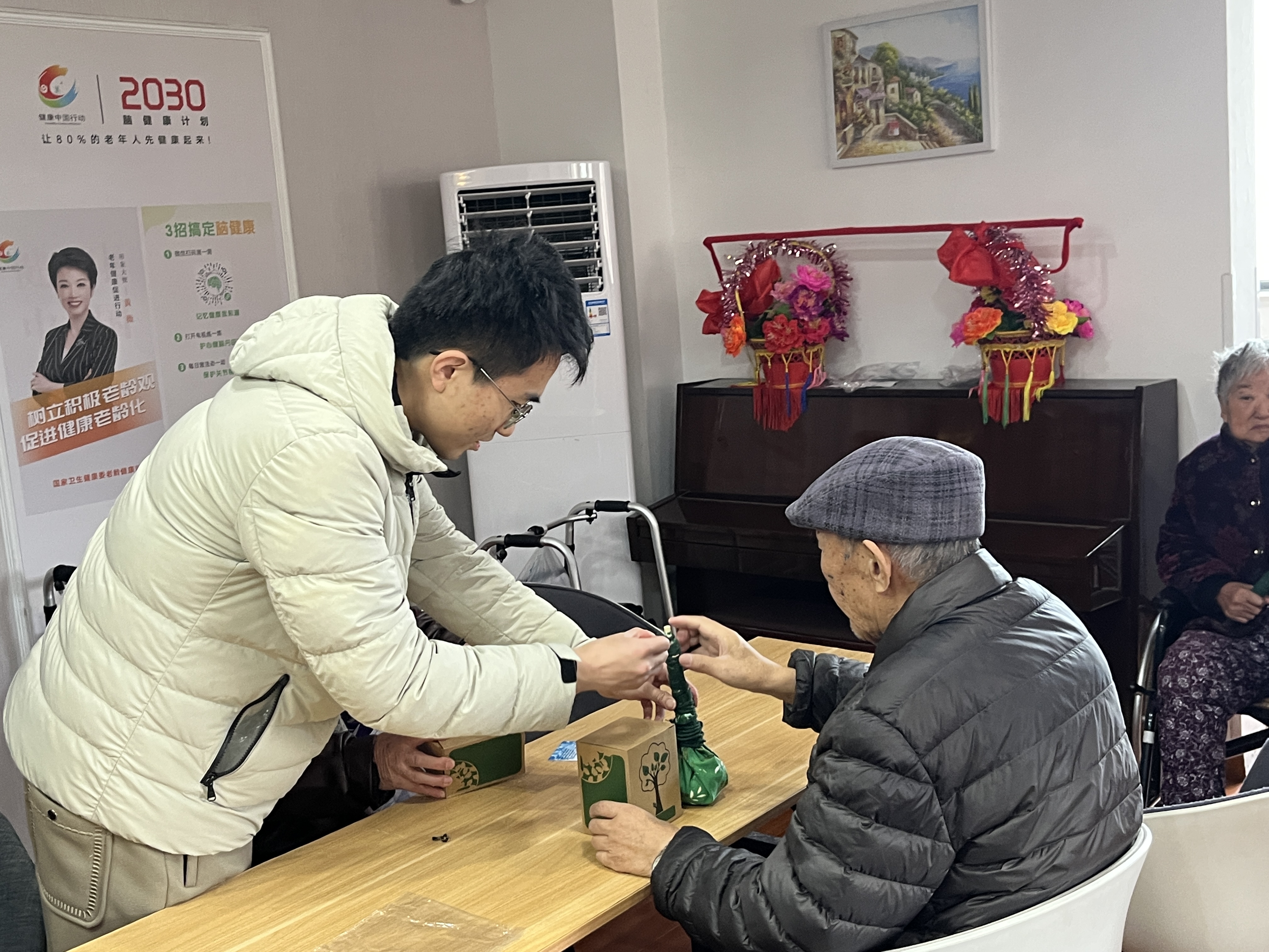 活动进入第三个环节,由衣芳慧同学为老人们讲解“艾草锤”的制作步骤。爷爷奶奶在各位志愿者们的指导下,开始尝试制作手工“艾草锤”。老人们认真跟随讲解的步骤动手操作,与志愿者一起动手指,动脑筋,现场气氛活跃。在志愿者的帮助下“艾草锤”完成,老人们纷纷迫不及待地展示和使用了他们的作品,每个人的脸上都洋溢着幸福的笑容。同学们的陪伴给老人们生活送去了欢乐与温暖。