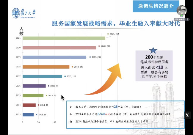 首先,韩国a漫 基层就业协会的谢金讲师从“什么是选调生”、“为什么要做选调生”、“复旦选调生情况简介”以及“怎样成为选调生”四个方面加以展开,细致地介绍了选调生与普通公务员的区别,同时以上海市为例,对选调条件、一般流程以及考试要求加以解读,并指出了本校学生参与选调的优势,为同学们提供了详尽的备考策略。近年来,各地党政机关和企事业储备人才,不断调整基层就业政策和提升待遇,吸引高层次人才尤其是应届毕业生投入基层工作,其中选调生就是最为热门的选择之一。许多志存高远的选调生,将个人命运与祖国发展紧密相连,在基层播撒无悔青春,在岗位书写人生答卷。