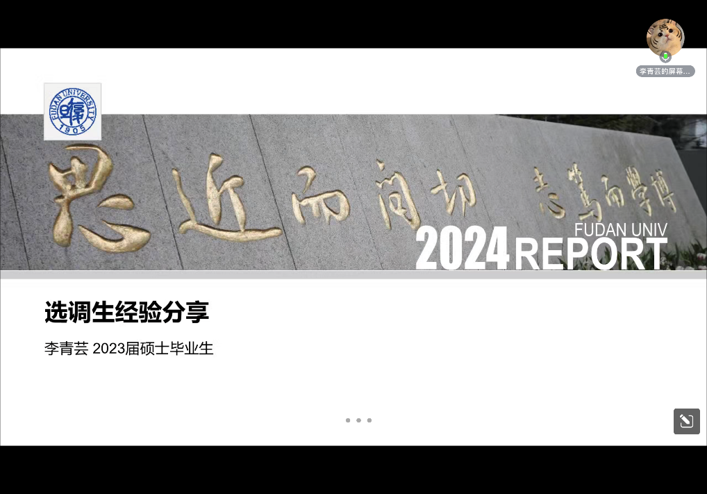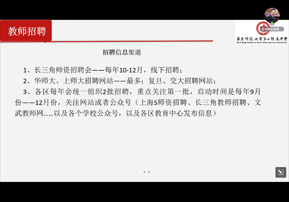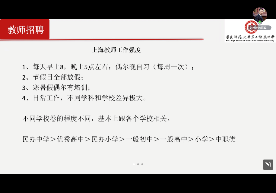 分享会最后,我系2024届博士毕业生张岩峰师兄作教师经验分享,他目前就职于上海市一所重点高中。他从上海教师工作情况、需要进行什么准备、招聘信息渠道等三方面为大家进行介绍,分享了教育工作中的点滴收获和感悟。他建议大家提前规划,在学有余力的条件下珍惜实习和实践机会,充分准备,打好“求职之役”。