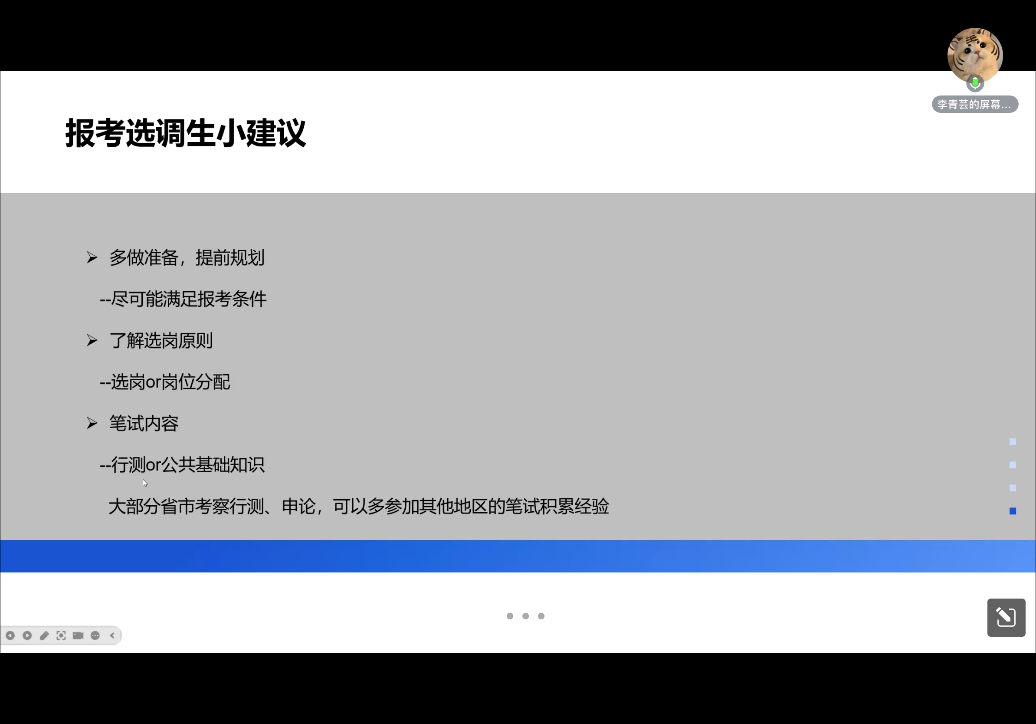 接下来,我系2023届硕士毕业生、四川省选调生李青芸作经验分享。她主要从“什么是选调生”、“四川紧缺选调”以及“备考经验分享”等三方面为大家进行分享。李青芸师姐首先为大家介绍了选调生的优势以及历年来的报考情况等基本信息,然后结合本专业的情况为同学们从报考岗位、面试和笔试的准备和需要哪些资料等方面进行了细致的分享。她借助这段时间的岗位经历为大家分享了选调工作的感受和具体情况,并为大家介绍报考选调生小建议。