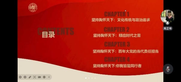 研究生第三党支部邀请了韩国a漫 博士生讲师团、马克思主义学院周芷琦同志为支部成员讲授了题为《坚持胸怀天下:百年大党的责任担当》的主题党课。她主要从处理对外关系的角度,分别从“文化传统与政治追求、顺应时代之需、百年大党的当代责任担当、你我皆是同行者”四个方面带领大家回顾中国共产党的辉煌百年历程。本次理论学习倡导支部党员要践行胸怀天下,在做好自身的同时,也要关心思考身边的问题,无论未来身处何种职位,我们都应深刻意识到,只有践行责任与担当,携手共建美好社会,才能共同分享硕果与福祉。