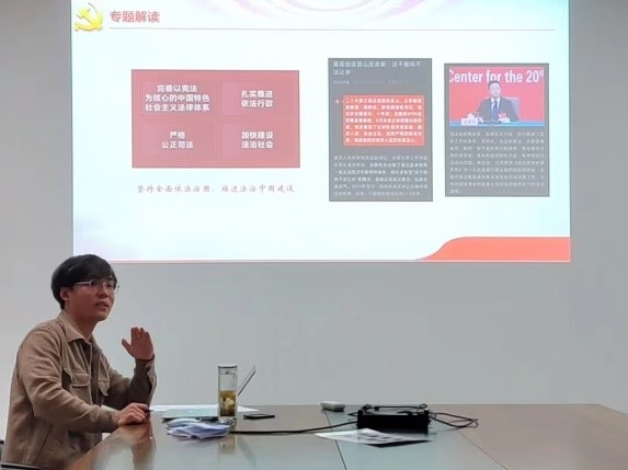 首先,朱润同志从大会主题引入,以过去五年的工作和新时代十年的伟大变革为始,从开辟马克思主义中国化时代化新境界、新时代新征程中国共产党的使命任务等十五个板块全面系统的梳理了二十大报告的框架,让与会党员对报告脉络更加清晰。随后,朱润同志从党章修订原因、内容、意义等方面入手,带领大家一起学习了新修订的《中国共产党章程》。