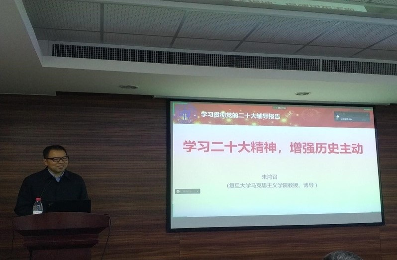朱鸿召教授的报告围绕二十大的主题与意义、二十大报告主要内容及历史自信与历史主动的时代要求等三个方面展开宣讲。宣讲指出,党的二十大对凝聚和激励全党全军全国各族人民高举中国特色社会主义伟大旗帜、为全面建设社会主义现代化国家团结奋斗具有十分重大的现实意义和深远的历史意义。我们党立志于中华民族千秋伟业,致力于人类和平与发展崇高事业,责任无比重大,使命无上光荣。报告从历史、时代、文明三个维度揭示了大会的意义,即党的百年目标完成后接着就是时代之问,中国正处于百年未有之大变局,关乎整个人类生存危机,而中国式现代化道路创造了人类文明新形态。接着朱教授通过与十九大报告对比的方式分析了二十大报告的总体框架结构,为大家详细解读了报告关于习近平新时代中国特色社会主义思想和实现路径,揭示了中国式现代化的基本特征、本质要求和战略安排。