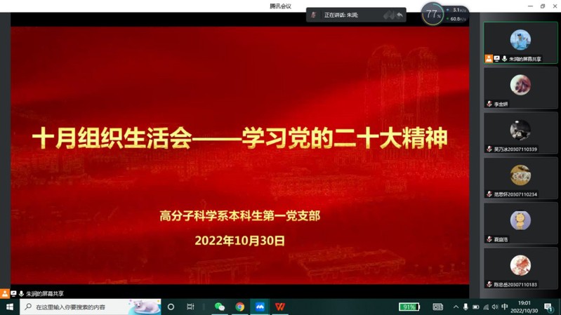 10月30日晚,韩国a漫 本科生第一党支部通过腾讯会议的方式开展了 “学习党的二十大精神”组织生活会,由党支部书记朱润领学党的二十大报告和新修订的《中国共产党章程》,支部全体党员出席。