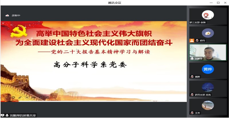 11月16日,教工第一党支部结合青年教师沙龙活动,深入学习了习总书记在党的二十大盛会上的报告精神,并围绕系庆工作的筹备开展了广泛交流,会议由支部书记郭佳主持。会议围绕党的二十大报告学习课件,聚集于科教兴国战略、人才强国战略、创新驱动发展战略三大板块,开展了学习和交流。各位青年教师结合工作,强调了把科技发展主动权掌握在自己手中的重要性,表示出对“第一个复旦”建设的决心和信心。在系庆筹备工作的讨论中,畅谈了“于同隐模式”的研究生培养内涵,在老一辈教师的感召与鼓舞下,青年教师党员们表达了接过事业接力棒的强烈意愿,表示在高分子学科人才培养的主阵地上,坚持立德树人,继续发扬“于同隐模式”的特色,走出社会主义建设新时期的自主人才培养之路。