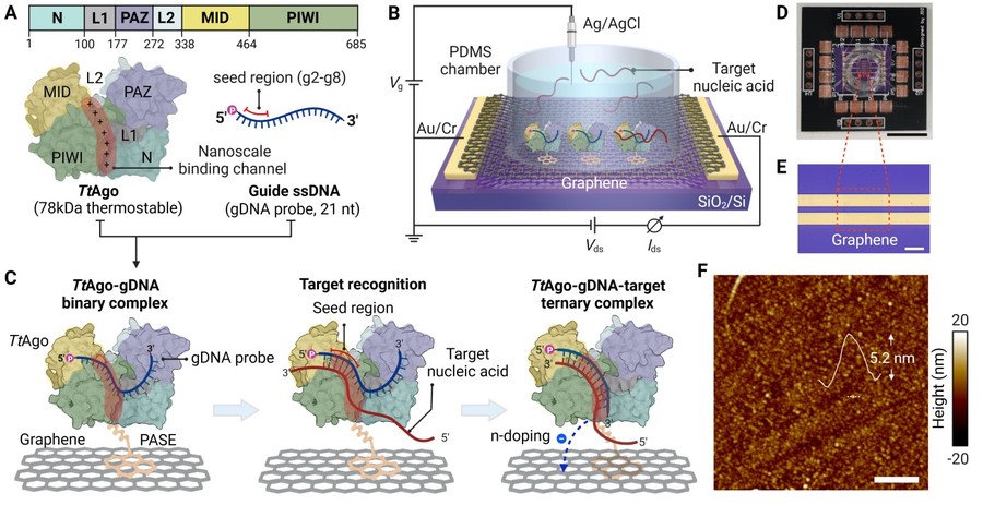 单核苷酸突变(SNV)是指DNA或RNA分子中某个位置的碱基发生改变,是遗传变异的最常见形式之一。SNV在人类健康和疾病中起着重要的作用,例如癌症、遗传性疾病和传染性疾病等。目前,检测SNV的方法通常需要复杂和耗时的核酸扩增或测序,而且在低丰度样本中难以同时实现高灵敏度和快速检测。为了解决这一难题,魏大程团队开发出了一种基于Argonaute蛋白介导的石墨烯场效应晶体管(Ago-GFET)平台,可以在几分钟内快速、灵敏和特异地检测SNV。