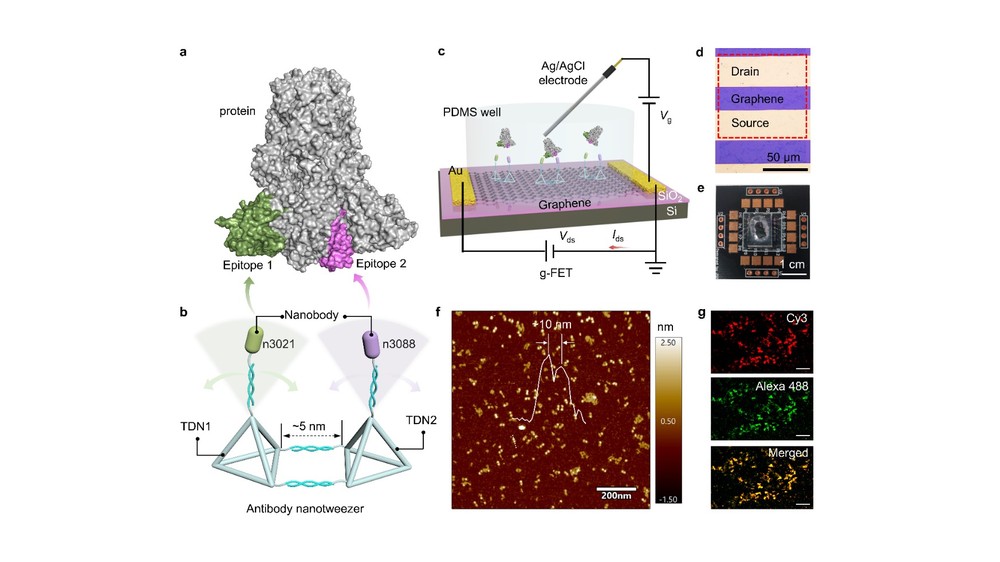 “抗体纳米镊”由DNA框架构建,通过控制两个纳米抗体之间的距离使得其与蛋白表面两个不同表位的距离匹配且每个纳米抗体局部有空间自由度,因此,两个纳米抗体可以精准地结合蛋白上两个不同表位且无应力,从而增强结合亲和力。此外,针对晶体管器件与生物体系的多价作用界面,该工作提出了“纳米抗体镊“的策略,通过DNA框架结构在纳米尺度上控制纳米抗体的间距和局域空间自由度,实现了具有空间自适应无应力地二价结合,为智能生物电子系统构建以及生物分子的精准检提供了一个新的思路。