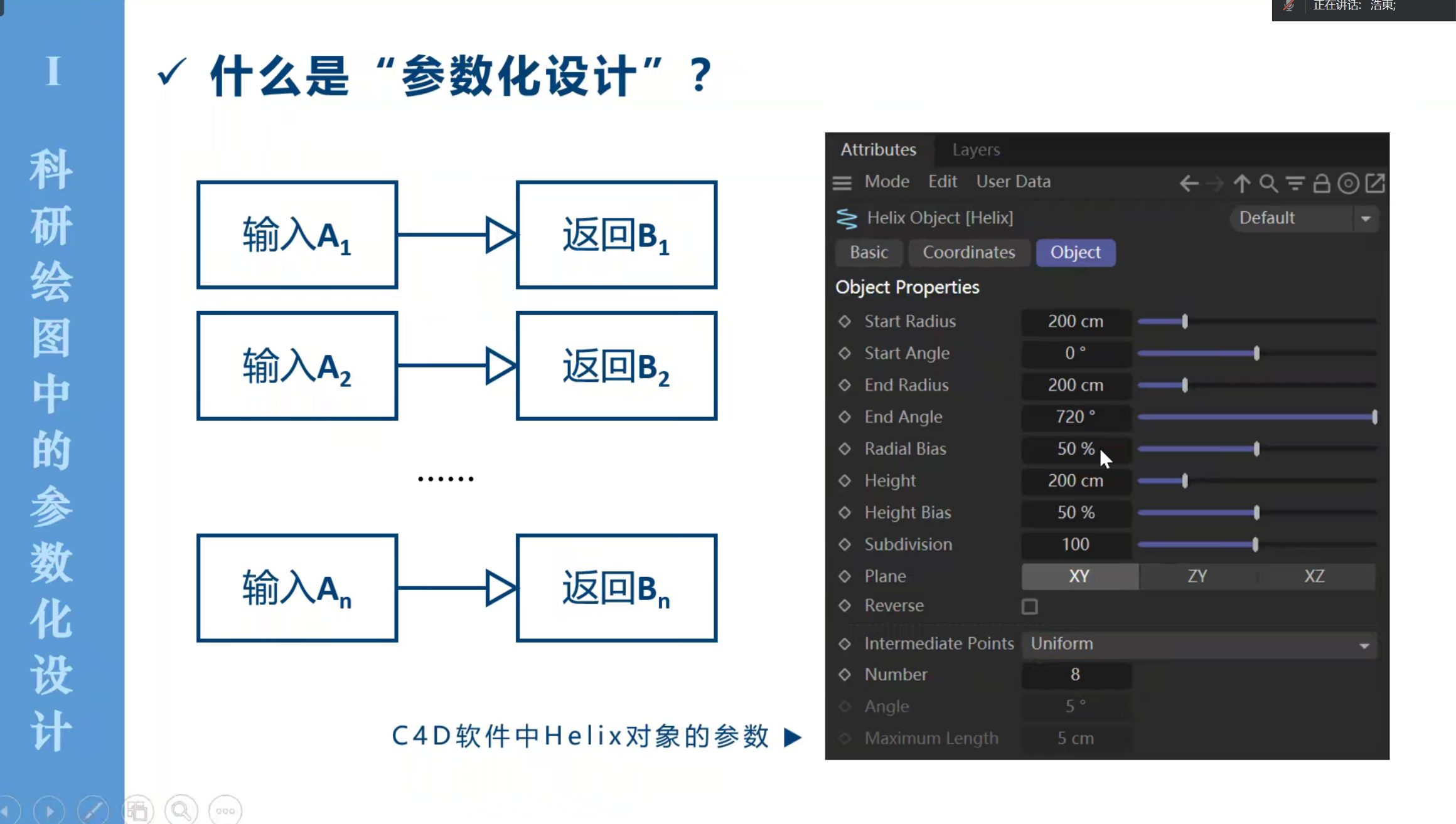 李浩东师兄讲到,从阿基米德螺线与伯努利螺线的差异引入参数化设计,可以通过参数控制结果的对象称为参数化对象。“3D软件中的任何图形与操作,背后均有其相应的数学公式”是参数化设计的前提条件,参数化的绘图方法过程更便捷,结果更科学,节点式的建模操作,也使再编辑不再困难。