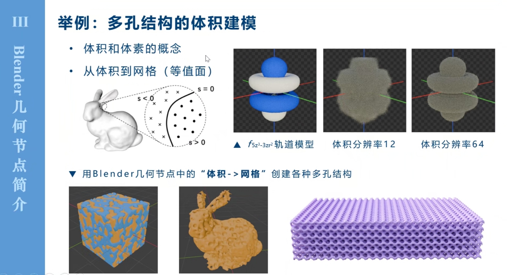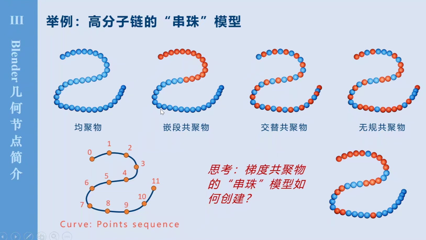 接下来以Blender为例讲解几何节点。李师兄讲到,其本质就是数据流的传递,并以高分子链的“串珠”模型与多孔结构的体积建模为例进行绘制,让同学们对几何节点的本质更清晰地把握。