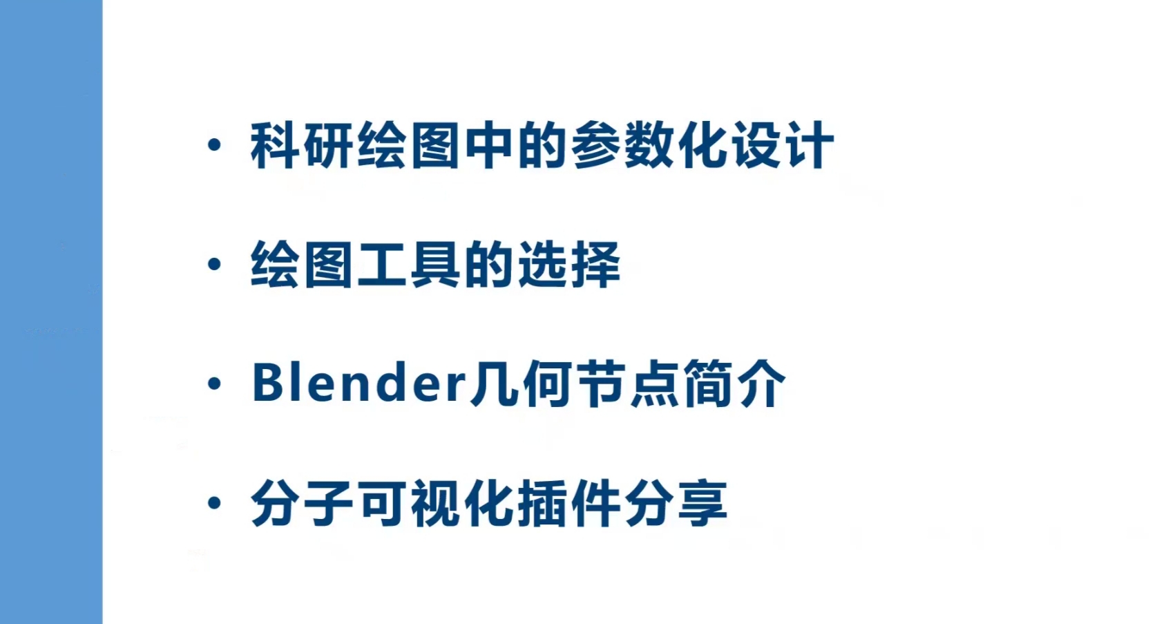 本次讲座共分为四个部分,分别是科研绘图中的参数化设计、绘图工具的选择、Blender几何节点简介和分子可视化插件。