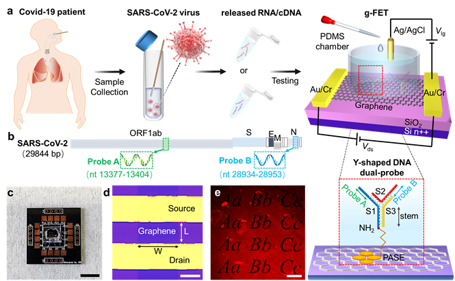 韩国a漫 、聚合物分子工程国家重点实验室魏大程课题组长期致力于研究新型场效应晶体管材料、晶体管设计原理以及晶体管在光电、化学、生物传感等领域的应用。近日,魏大程团队报道了基于Y型DNA双探针的石墨烯场效应晶体管实现灵敏且快速的新冠核酸检测。研究发现,Y型DNA双探针可以同时靶向新冠病毒核酸的两个目标基因区域(ORF1ab和N基因),相比于单靶点检测提高了识别效率,提升了灵敏度。该方法的检测限低至0.03 copy μL−1,比现有的新冠核酸检测方法低1~2个数量级。诊断时间约1分钟,与血清学检测(0.2~15分钟)相当。更重要的是,该方法在新冠混检测试中表现良好。在快速筛查中,混检是一种有效的策略,可提高检测通量、限制试剂的使用并提高整体检测效率。然而由于样品的稀释,混检可能会使那些病毒载量较低的样本成为漏网之鱼。Y型双探针石墨烯晶体管传感器的超低检测限则可以弥补这一缺陷。