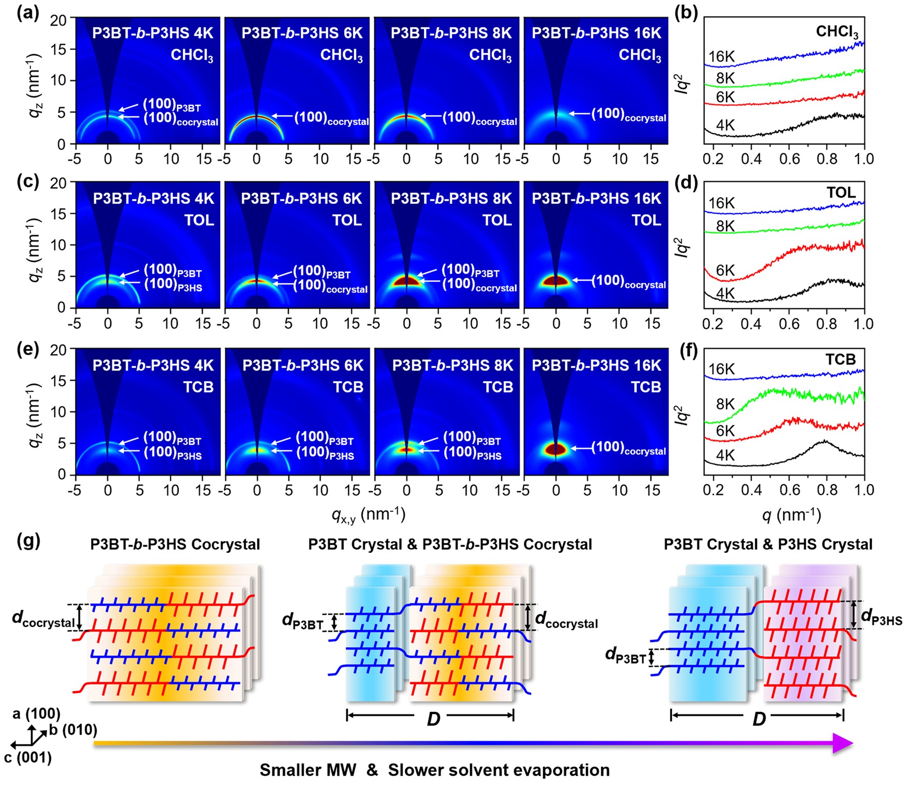 图5. (a-g)不同分子量的P3BT-b-P3HS经三种溶剂成膜后的GIWAXS结果、 SAXS结果以及P3BT-b-P3HS形成共晶和微相分离结构的示意图。
