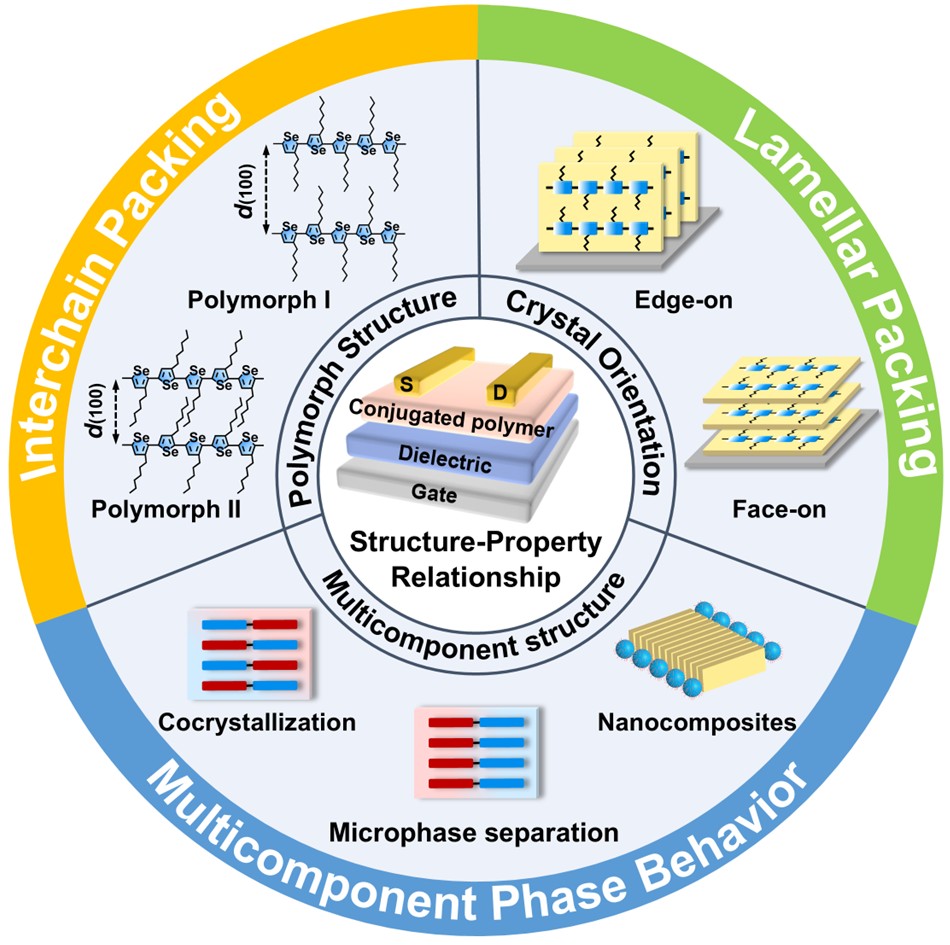 图1. 共轭高分子具有代表性的凝聚态结构(晶型、结晶取向和共晶结构等)的调控及其载流子传输性能。