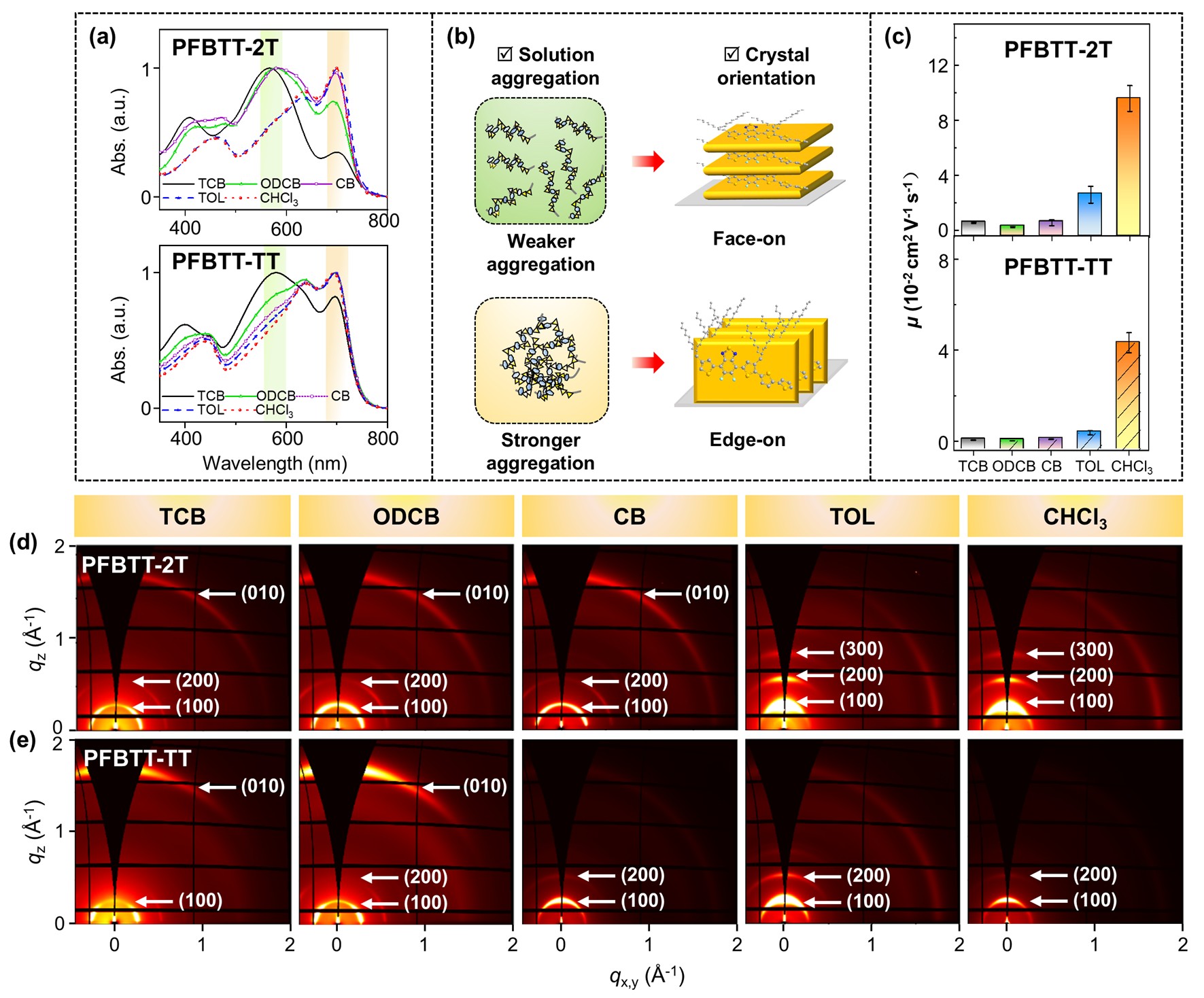 图4. (a-e) PFBTT-2T和PFBTT-TT在五种不同溶剂中的紫外吸收光谱、溶液聚集示意图、薄膜态的掠入射广角X射线散射(GIWAXS)图像和载流子迁移率。