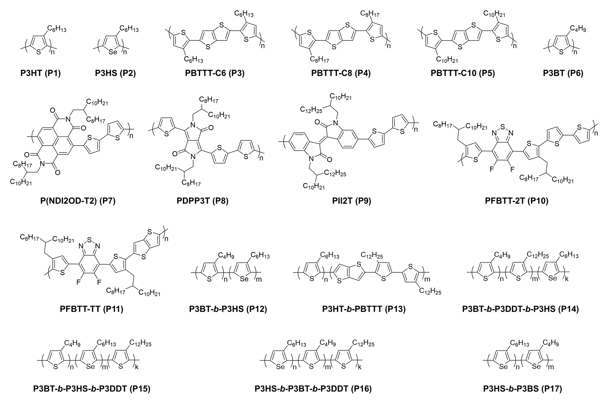 图2. 文中具有代表性的共轭高分子的分子式。