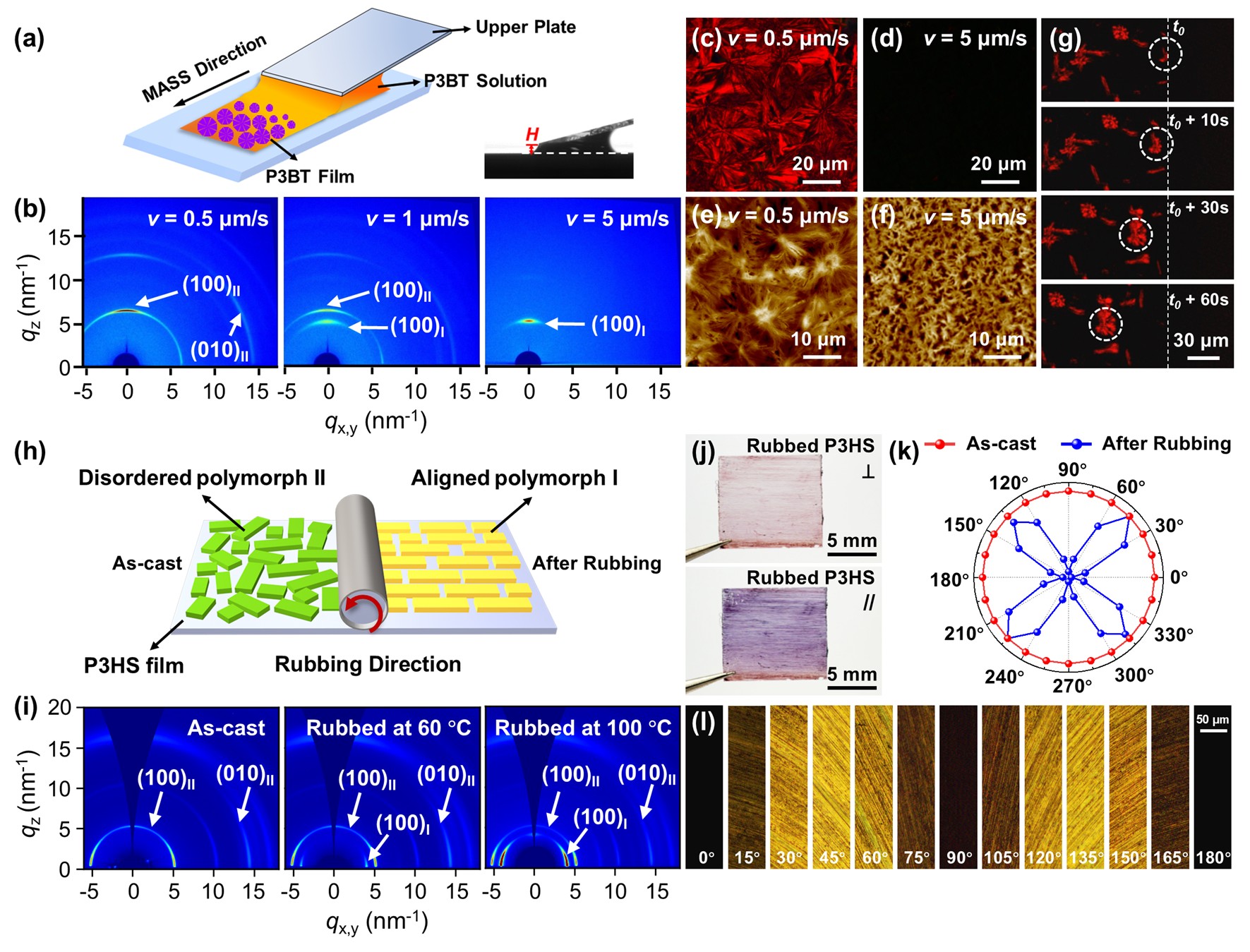 图3. (a-g)通过二维空间限域结晶策略调控聚(3-丁基噻吩)晶型II到I的转变;(h-l)通过机械摩擦调控聚(3-己基硒吩)晶型II到I的转变。