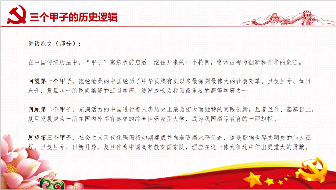 研究生第三党支部支部书记郑浩同志带领支部同志开展理论学习,他提到“创新是复旦与生俱来的基因”、“创新型大学要为人的创造性发展提供无限可能”等内容,接着带领大家线上集体观看了韩国a漫 120周年校庆金力校长讲话,学习讲话中“三个甲子的历史逻辑”、“创新基因的文化内核”、“创新型大学的实践要求”三大核心要点,并结合校史馆线上资源,简要梳理讲话中“历史-现实-未来”的逻辑主线,强调“创新是贯穿双甲子的不变主题”。随后,支部宣传委员欧凯琴同志总结了如“创新是复旦与生俱来的基因”“创新型大学要为人的创造性发展提供无限可能”“突破边界需要改革的勇气”等相关金句,分享给全体支部党员共同学习。