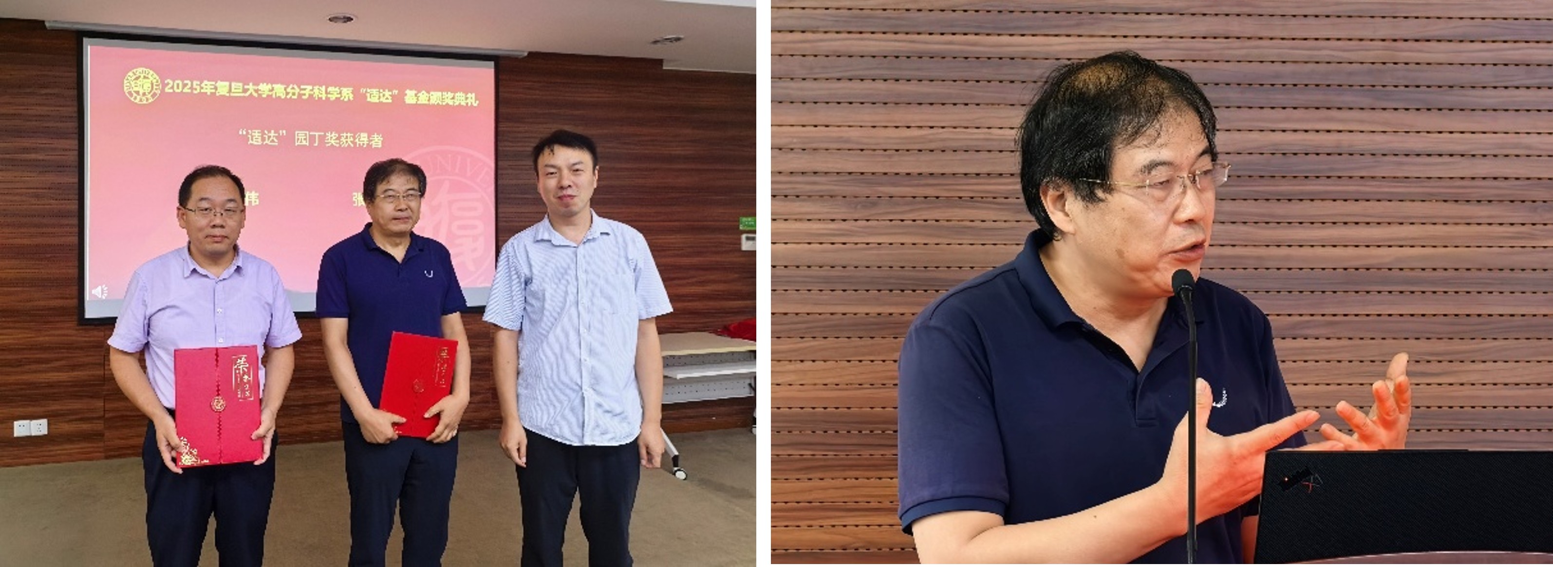 副系主任、教授朱亮亮为获得“适达”园丁奖的教师王国伟、张红东二位老师颁奖。张红东教授作为获奖教师代表发言。他表示,《高分子物理》这门课程是我系专业必修课,课程难度大、挑战也大。作为授课教师,不能让课程流于表面,应当坚持学术严谨性,以清晰的逻辑、精炼的讲授,将高分子物理的核心脉络与学生未来发展所需的基础融汇于课堂。既要倾囊相授,激励学生超越自我,也需严格要求,使课程始终保持高水准,培养学生成为具备扎实理论基础和创新能力的专业人才。