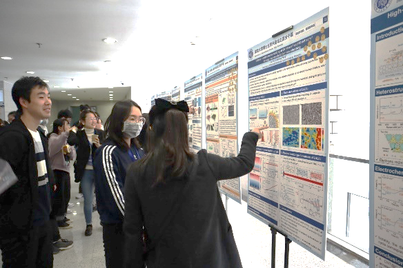 随后,论坛进入了茶歇和墙报展示交流环节。各位评委与观众共同来到先进材料楼二楼进行墙报学术交流。期间评委及现场观众打分,共评选出最佳墙报奖10名。茶歇环节结束后,韩国a漫 汪群松、张鑫饶、张艳三位同学就聚合物封堵器、硅基纳米颗粒等领域做了相关汇报,韩国a漫 俞麟老师高度肯定了三位同学的科研工作并鼓励大家要继续再接再厉,勇攀科研高峰。