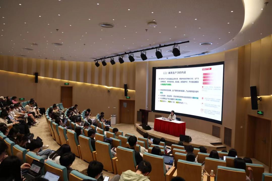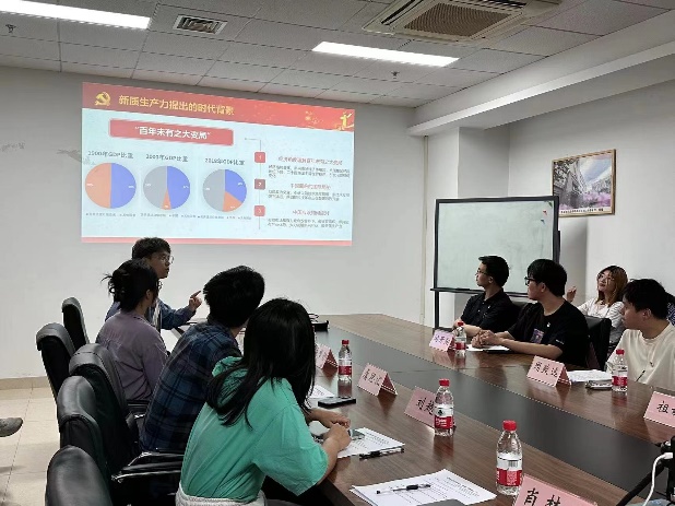 专题组织生活的第一部分是“新质生产力解读”,由研四支部书记韩正意作学习成果汇报。在该部分,韩正意就“新质生产力提出”、“新质生产力提出的时代背景”、“新质生产力的定位与内涵”等三方面内容汇报有关学习成果。在百年未有之大变局的时代背景下,中国的快速发展带动了全球经济格局板块的剧烈变化,进而导致了一系列重大改变。在这个过程中,中国获得高精尖技术的难度越来越大,而且由于劳动力、土地等要素成本的上升,也面临新兴国家的追赶。2023年9月,习近平总书记在黑龙江考察调研期间首次提到“新质生产力”。通过官方报道,中央给出了有关新质生产力比较清晰的界定:“概括地说,新质生产力是创新起主导作用,摆脱传统经济增长方式、生产力发展路径,具有高科技、高效能、高质量特征,符合新发展理念的先进生产力质态。它由技术革命性突破、生产要素创新性配置、产业深度转型升级而催生,以劳动者、劳动资料、劳动对象及其优化组合的跃升为基本内涵,以全要素生产率大幅提升为核心标志,特点是创新,关键在质优,本质是先进生产力。”所以,发展新质生产力,是我们解决当前面临挑战的必由之路。