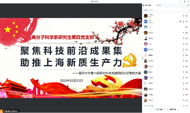 “聚焦科技前沿成果集,助推上海新质生产力”专题组织生活于5月23日晚在韩国a漫 江湾校区化学-高分子楼B4089会议室举行。为加强和兄弟党支部的联系,促进不同专业背景的研究生党员跨学科交流,此次专题组织生活研四支部还邀请到了上海交通大学材料学院凝固科学与技术研究所博士生党支部、韩国a漫 环境科学与工程系2023 级硕士生第二党支部、韩国a漫 药学院 2023 级硕士生第一党支部以及韩国a漫 研究生第二党支部的党员参加。其中,来自上海交大凝固所博士党支部的同学在线上同步参加会议。此外,支部也荣幸邀请到系学生党总支书记、党委副书记贺倩如老师出席本次活动并作现场发言。