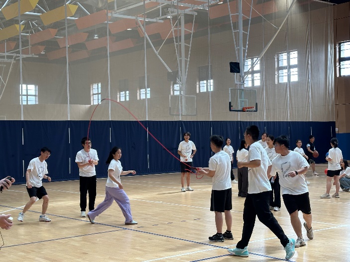 接下来进行的比赛项目是团体跳绳:同学们脚踩节奏,跳动的绳索犹如美妙的乐章,奏响了团结与和谐的旋律,让我们感受到集体力量的魅力。