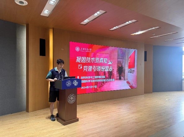 参观环节结束后,双方人员乘车来到上海交通大学材料学院A楼A500姚征报告厅。凝固所博士支部书记董续雨作“凝固技术致真知,党建引领报国志”主题汇报。第一部分是主题实践活动回顾。此前7月5日,凝固所博士支部前往中国航天科技集团第一研究院开展暑期社会实践活动。交流会上,董续雨回顾了参访历程,介绍了航天一院发展情况和我国当前航空航天事业取得的进展。我国的航空航天事业近年来取得了长足的进步,一大批领先世界的高精尖成果不断涌现,带动了高新技术的发展,促进了新质生产力的形成。第二部分,董续雨作关于支部建设成果总结的汇报。凝固所博士支部扎实做好理论学习工作,认真学习贯彻党的二十大精神,通过参观红色场馆、红色展览等加深党员对相关理论的认识。同时,支部积极开展社会实践活动,走进航天院所、遵义会议旧址和开展志愿服务,发挥了支部战斗堡垒作用。