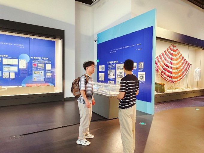 首先,凝固所博士支部书记董续雨带领双方人员前往文博楼,参观上海交通大学校史馆和“铸剑牧星—‘两弹一星’功勋科学家王希季校友专题展”。交通大学历史厚重,研四支部成员在参观过程中对相关历史脉络有了深刻的了解,董续雨和支部其他成员积极发挥讲解员的作用,为同学们延伸出更多精彩的故事。在“铸剑牧星—‘两弹一星’功勋科学家王希季校友专题展”参观环节,双方成员对于航空航天的认识更加全面,主动将其与新质生产力理论结合,时常驻足讨论,真正做到在实践中学,在学中实践。