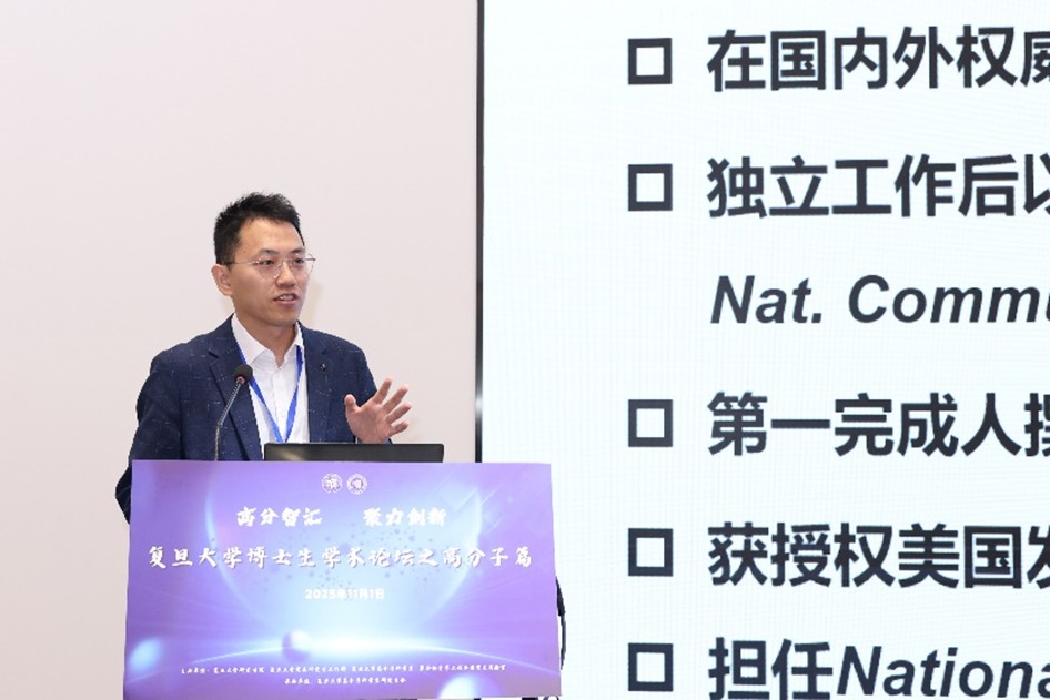 接着,孙浩老师为我们带来题为“聚合物分子工程构筑高性能转化型电池体系”的特邀报告。孙老师首先回顾了自己在复旦高分子系的求学经历及博士期间关于纤维能源器件智能化与集成化的研究工作。他的研究聚焦新型电化学储能体系,致力于通过正负极材料与反应机理的创新,实现电池能量密度与功率密度的协同提升。研究以“聚合物合成—界面调控”为核心思路,对锂离子吸附沉积及转化型正极的离子电子传输等关键过程进行精准调控,构筑出高比能、高功率且安全稳定的储能器件,展现出在前沿能源领域的广阔应用前景。