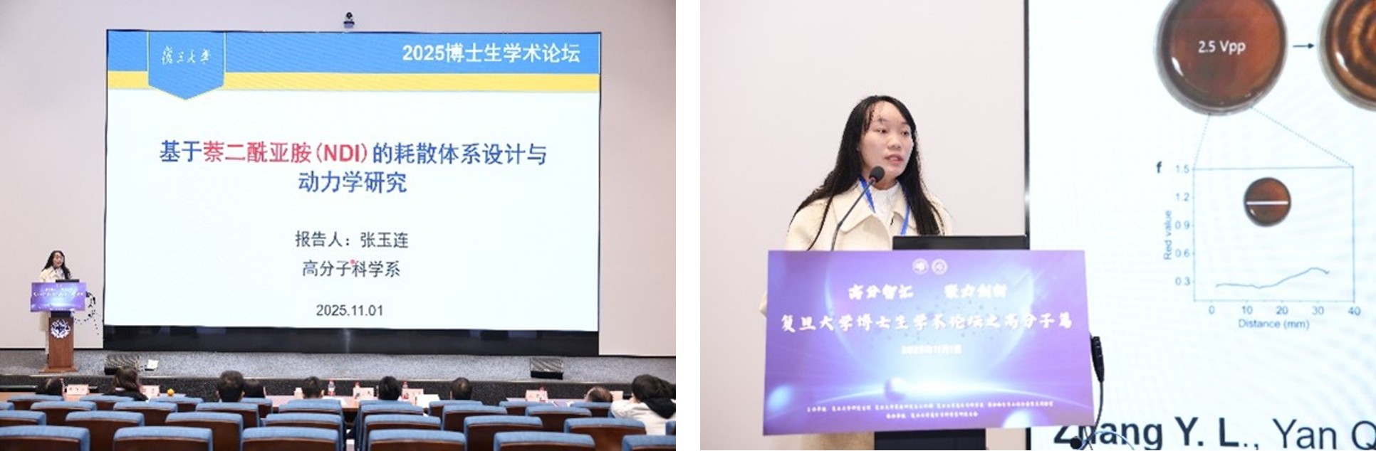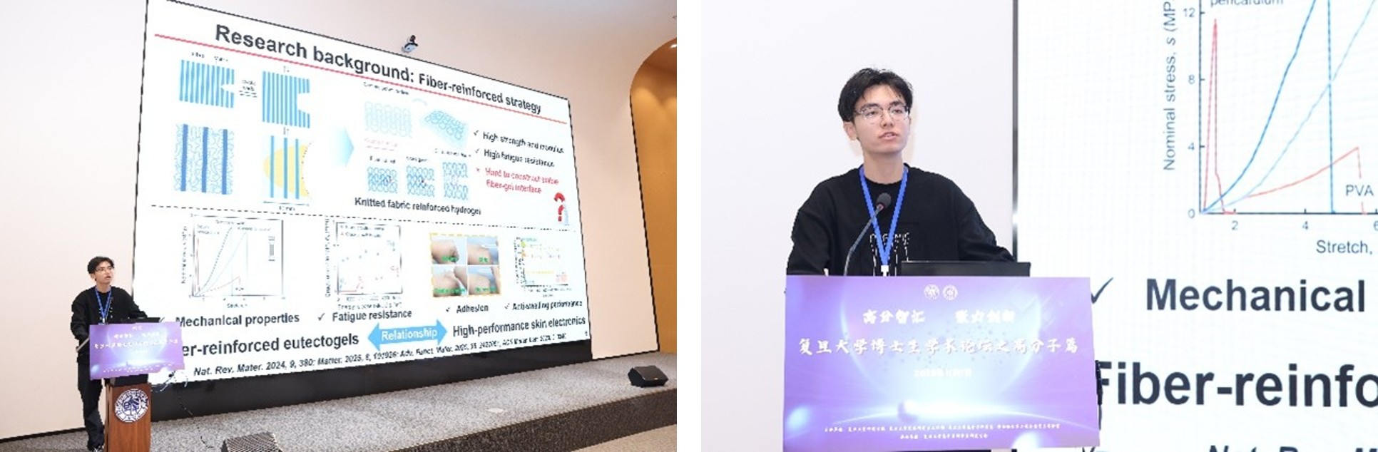 系研究生会主席李春霖介绍论坛概况。本届论坛以“功能与智能高分子材料”“高分子与健康应用”“高分子结构与物性前沿”为核心方向,旨在为高分子及相关交叉领域青年学者提供高水平交流平台,推动学术思想与实践成果的深度融合。经过评审小组评选,最终12位同学脱颖而出进入口头汇报环节,22位同学入围墙报展示。
