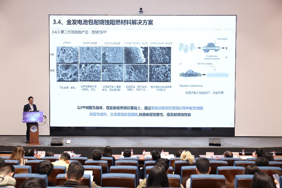 随后,叶士兵老师做了题为“塑料阻燃技术的发展及其在新能源汽车的应用”的特邀报告。叶老师系统介绍了高分子材料阻燃技术的发展历程与主要研究成果,阐述了高分子材料在新能源汽车的轻量化与安全性能提升中的关键作用。他还重点展示了耐烧蚀聚合物在电池包等高压电气材料中的应用潜力、塑料阻燃体系设计与相关产业化技术的创新成果,为高分子材料在新能源领域的安全可持续发展提供了新的思路。