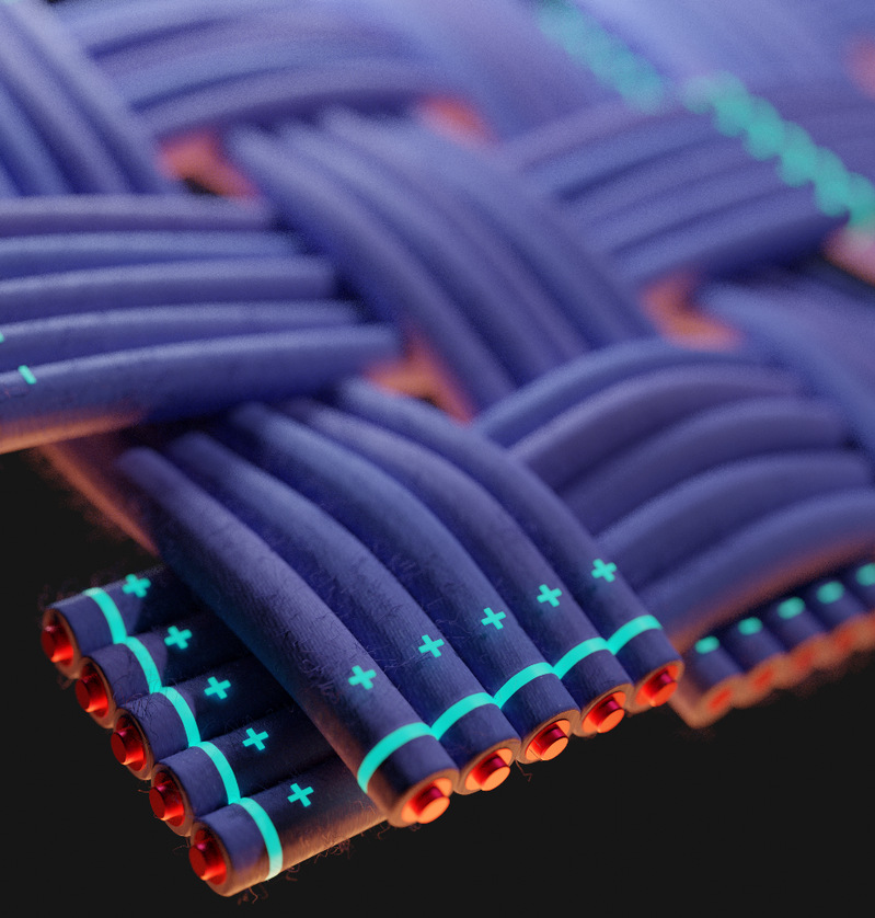 新型纤维聚合物锂离子电池成果于2021年9月发表在Nature上(“Scalable production of high-performing woven lithium-ion fibre batteries”, Nature, 2021, 697, 57),这项工作重点发现了纤维锂离子电池内阻与长度之间的双曲余切函数关系,有效解决了活性材料和纤维电极界面稳定性难题,连续构建出兼具高安全性和高性能的新型纤维聚合物锂离子电池。纤维聚合物锂离子电池的能量密度超过85 Wh/kg,并且具有良好的循环稳定性,循环500圈后电池的容量保持率仍然达到90.5%,库伦效率为99.8%。即使在曲率半径为1厘米的情况下,将纤维锂离子电池弯折10万次后,其容量保持率仍大于80%。进一步通过纺织方法,获得了高性能和高安全性的大面积电池织物。如果将电池织物和无线充电发射装置集成,可安全、稳定地为智能手机进行无线充电。新型纤维聚合物锂离子电池有望在智能织物、可穿戴设备、生物医疗器械等广泛领域显示重要的应用前景。