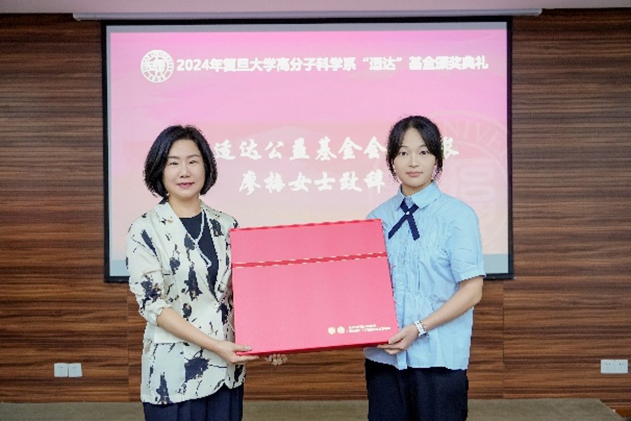 上海适达公益基金会理事长廖梅女士为获得“适达”学生奖的朱泓宇、谢绮萱、吴官玲、杨子俊、洪凯楠和赵春晖颁奖。赵春晖作为获奖学生代表发言。她表示,科研之路并非坦途,需要扎实的专业知识、敏锐的洞察力、坚忍不拔的毅力和勇于创新的精神,未来会不断提升自己,以更加饱满的热情和更加坚定的信念投身于高分子科学的研究之中,努力成为高分子领域的优秀工作者。