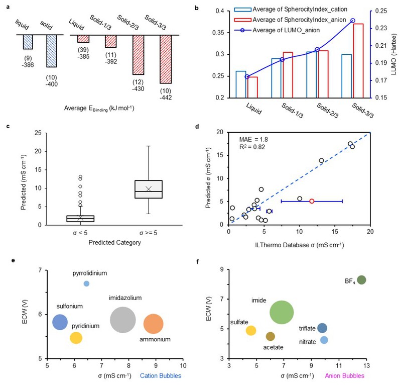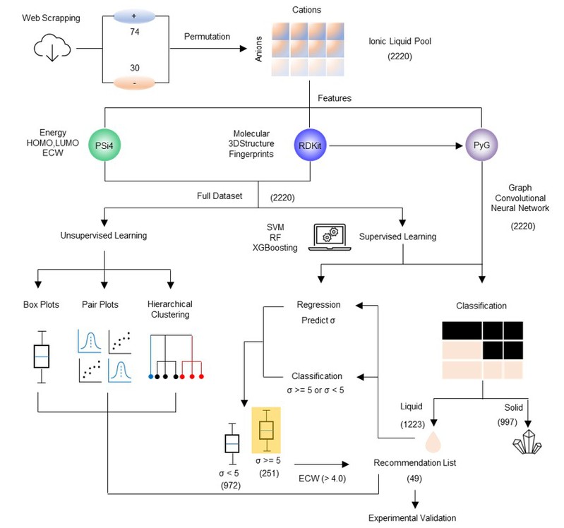 图1. 筛选具有高离子电导率和宽电化学窗口的离子液体的机器学习工作流程