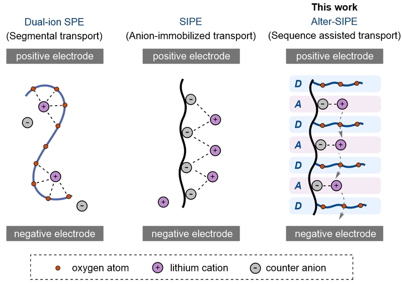图1. 锂离子迁移机理示意图。左)基于链节运动的离子迁移模式(以电中性聚合物与锂盐混合物为例);中)基于跳跃的离子迁移模式(以单离子导电聚合物为例);右)本研究提出的交替序列促进的离子迁移新模式。