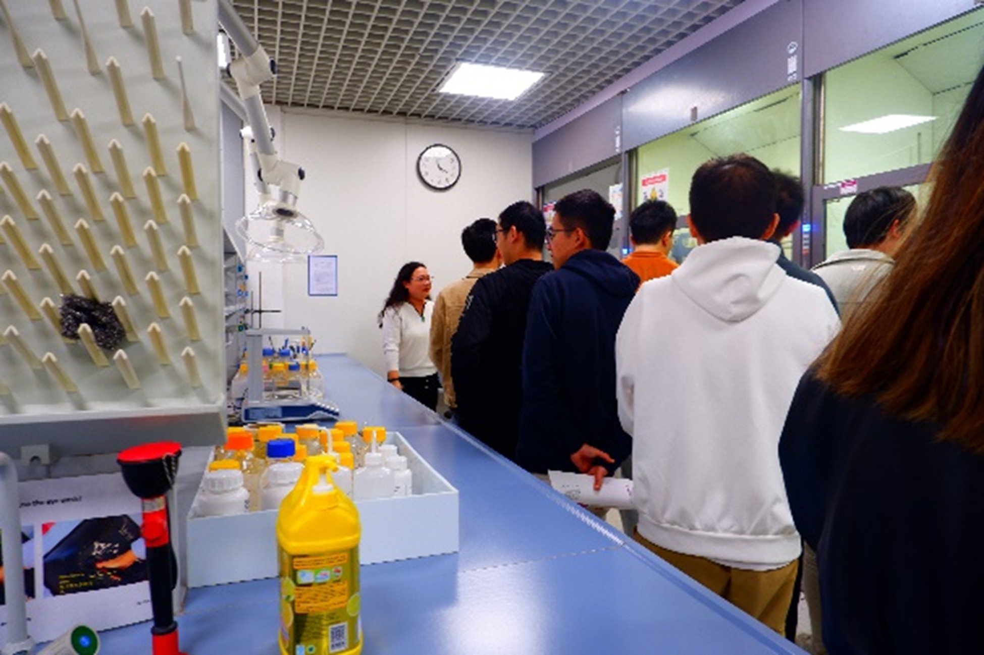 随后,同学们兵分两路,分别对个人护理品方向、锂电池方向等实验室进行了参观。在这个过程中,负责人为同学们介绍了该实验室的基本背景、研发情况和仪器设备运作等,与同学们积极讨论沟通,为大家仔细梳理了实际生产与实验室科研之间的关联和差异,进一步使同学们对相关学科产业链有了更加全面的了解。