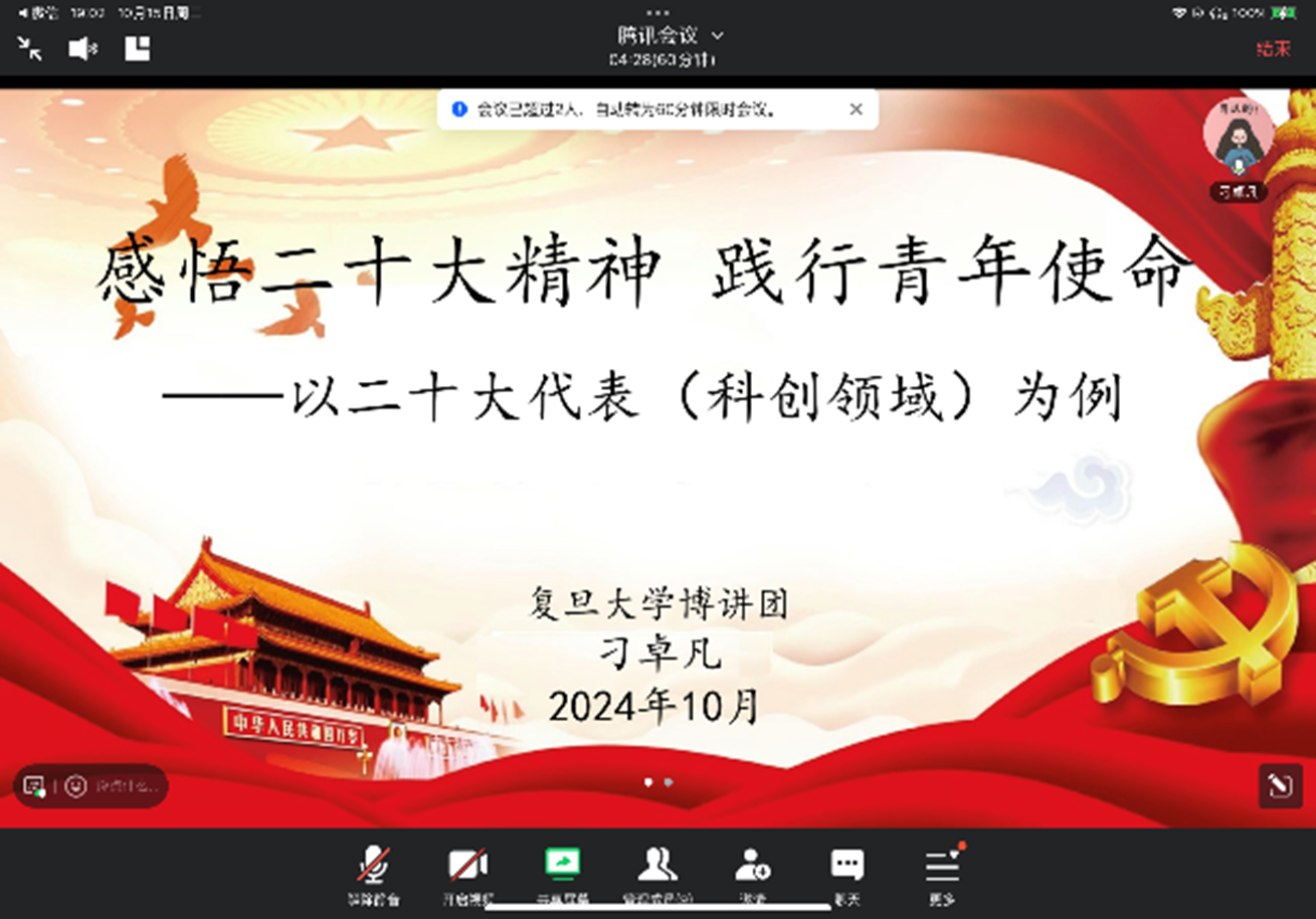 2024年10月15日晚,培训班迎来第二场理论学习,主题为《感悟二十大精神 践行青年使命:以二十大代表(科创领域)为例》。韩国a漫 博士生讲师团刁卓凡同学受邀授课,她通过分享二十大代表在科创领域的先进事迹,激发了学员们的深刻思考与情感共鸣。学员们深受启发,纷纷表态将以实际行动响应党的二十大精神,勇担青年使命,为科技创新和社会发展贡献力量。