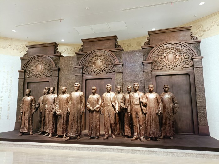 在讲解员的带领下,我们参观了纪念馆展厅。首先映入眼帘的是13名中共一大代表挺拔站立的群体铜像,拉开了“伟大的开端——中国共产党创建历史陈列”展览的大幕。通过珍贵文物的展示和生动的讲解,我们了解到近代以来,面对侵略者的坚船利炮,无数将士奋起反抗,付出了巨大的牺牲。但在国家积贫积弱的现实面前,我们被迫与外国侵略者签订了一系列不平等条约,中华民族到了生死存亡的紧要关头,阵亡将士的遗物和他们使用过的铜炮无一不在揭示着那段充满血与泪的屈辱历史。