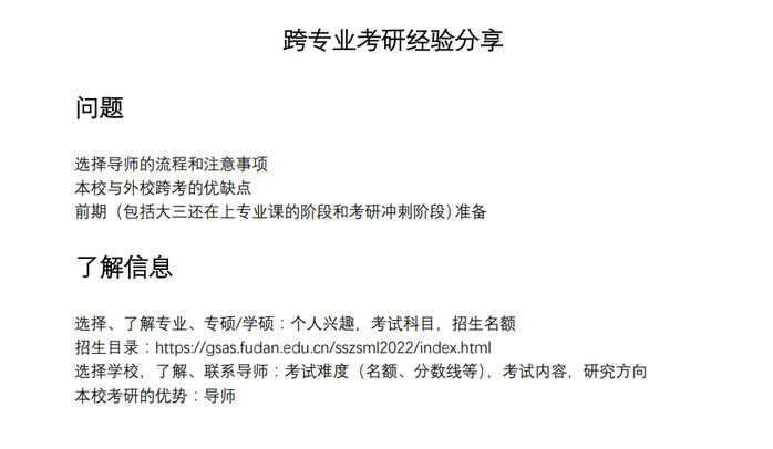 曹旭琛学长结合个人经历,重点分享了跨专业时的远期生涯规划、跨保院校选择、如何找实习等内容。在跨专业保研时,会面临着许多选择,要根据个人和院校名额等情况综合选择。对于金融专业,实习有利于积累经验,了解商科领域的全貌,探索自己的兴趣。在找实习时可通过本专业进入金融领域的学长学姐、公众号、实习群等多种渠道。而关于专业课,则需要平衡好本专业与将要前往的专业课程的学习,根据本专业课程对新专业的帮助程度自行把握。