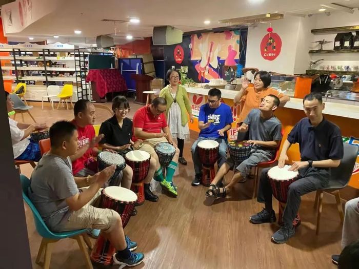 小组成员秉持立足社会、服务社会的精神,将学习与实践相结合,前往湛蓝工作室担任志愿者。湛蓝工作室旨在帮助成年自闭症患者逐渐康复,小组成员在工作室中与学员们分享书本上的心理学故事,并一起学习了金贝鼓合奏。