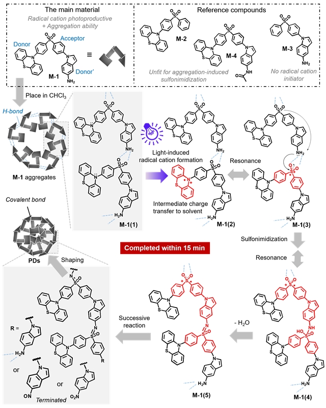 PDs形成机理研究中发现,作为前驱体D-A-D’构型的该类分子,具有产生光诱导离域自由基阳离子的能力,并可以通过分子间氢键的模板限域作用进行逐步缩合聚合反应。作者通过分析一维核磁、二维核磁和Maldi-tof的测试结果也证实了不同聚合度物种的存在。