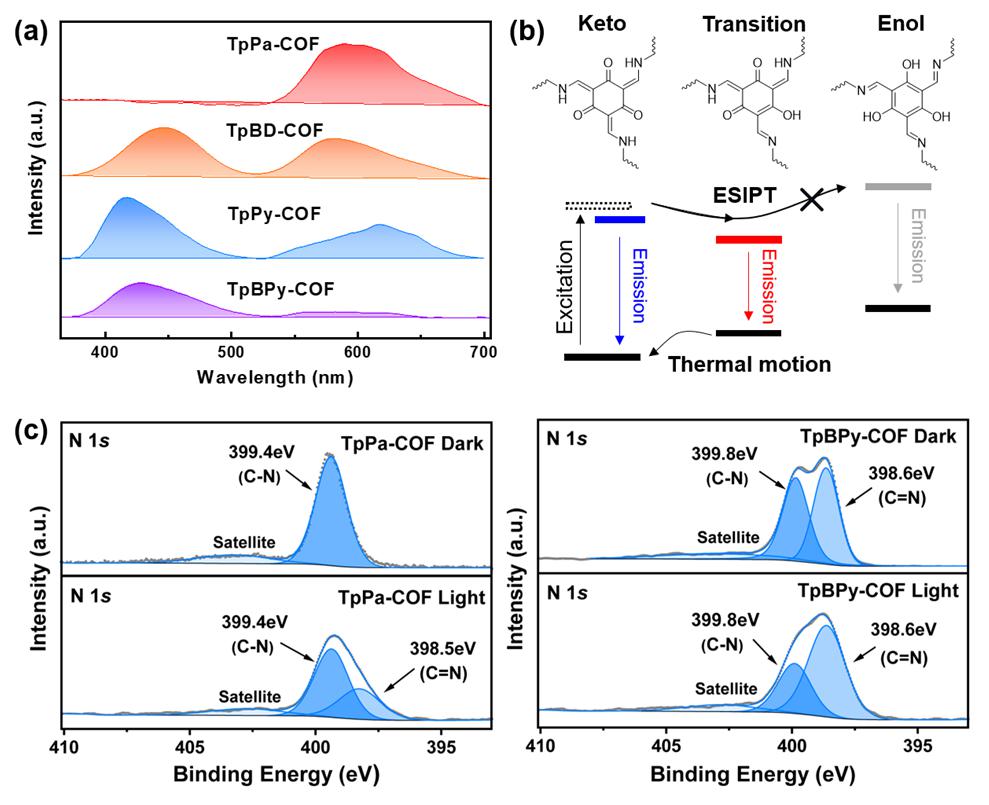 在第一项工作中,作者通过荧光光谱、原位XPS等技术在一系列酮烯胺键连接的COFs中首次证明了ESIPT诱导光异构化现象的发生。在激发态下,COF结点处的酮烯胺结构会发生部分的结构转变,形成由酮烯胺和醇亚胺键混合组成的部分醇化结构。这些光诱导异构体能够展现出一系列优异的光物理性质,如更窄的能带结构、扩展的π电子共轭以及延长的电荷分离寿命。