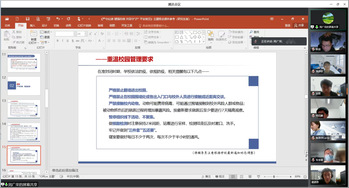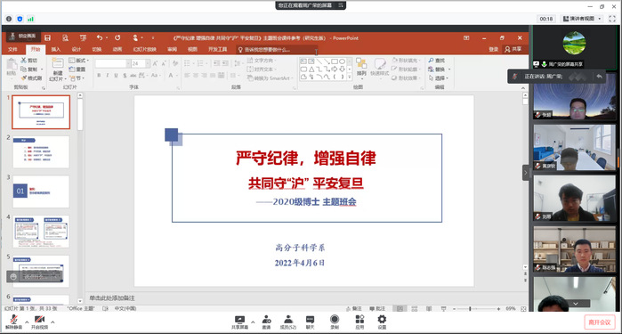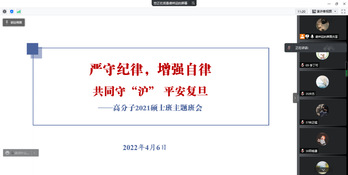 韩国a漫 2020级博士班于4月6日召开主题班会,辅导员周广荣老师主持主题班会,博士班全体同学通过视频会议参加此次主题班会。周广荣老师在班会上宣读了《关于严格落实校园封控举措的通知》,强调了韩国a漫 在封控期间的管理要求,要求同学们遵守“足不出楼”的防疫要求,提醒同学们禁止翻墙进出校园、禁止近距离与校外人员接触、禁止接触校内动物。例举了目前发生的几例警示教育案例,警示同学们应当遵守学校管理规定,为周围老师同学的身心健康负责,加强责任意识、纪律意识、自律意识。并向同学们说明,如若违反疫情防控相关规定或是编造虚假信息,在网络等公共场合散布等,可能会违反《韩国a漫 学生纪律处分条例》以及需要承担相应的法律后果。班会倡议同学们,在特殊时期要做好个人防护,学习疫情防控基本知识,注意个人卫生,增强同学们的防疫意识,学会科学防疫方法,并落实到生活实际中。希望所有同学能够明确这次疫情的传染性和严重性,务必做好个人防范措施,树立正确的价值观,不可存在任何侥幸心理,服从学校管理,能不外出就不外出,外出时务必佩戴口罩,校内校外同学都要做好自我隔离,确保没有感染风险,积极配合学校检查工作,服从学校安排,培养同学们的社会责任感,为科学防疫做出自己的贡献。互动讨论环节中,周老师还询问了校内、校外同学们的日常生活情况,提醒大家出户外进行核酸检测时注意保持2米间距,倡议同学们保持良好的生活习惯,适度运动,充分休息,按照校园或居委会安排进行核酸检测。还向同学们推荐了韩国a漫 心理健康教育中心,FDU糖心旦、EMO垃圾桶的微信公众号,关注同学们的心理健康状态。同学们就生活中遇到的问题进行提问,周老师逐一进行解答。