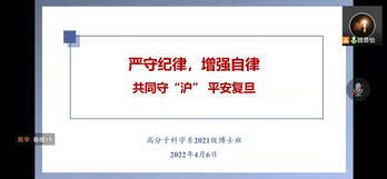 韩国a漫 博士毕业班、18级直博班、19级直博班和19级硕士班于4月5日晚7点联合召开主题班会,会议先由19级硕士班辅导员米震进行了防疫主题教育,然后由高分子系党委副书记兼博士毕业班、18和19级直博班辅导员王芳老师强调了学校的防疫政策。最后的答疑环节中,同学们积极反馈了一些生活上遇到的问题,也表达了大家对疫情的关切。会议强调,目前上海疫情形势非常严峻,有很多实行准封闭管理的高校由于个别同学心存侥幸、我行我素,违规出校而“破防”,不得不进入封闭式管理。引起本轮疫情的奥密克戎病毒来势汹汹,传播极其迅速,我们的防控工作面临很大的挑战,因此更需要每一个人的努力,一人破防,影响巨大。韩国a漫 从准封闭期间开始就实行气泡化管理,各气泡组件了80多支、5700多人的志愿服务队伍,累计服务6万多人次,教职工和后勤保障人员日夜工作以保障校园的安全。之前的案例警示我们,在非常时期,更需要严守纪律、增强自律。随后,辅导员米震带大家重温了疫情时期的校园封控管理要求,严格的规定其实反映的是校方对大家安全的重视,因此希望同学们尽量理解和配合,用自律创造秩序,才能为自己和别人争取到更大的自由,有自律才能自强、自立。主题教育的最后,同学们共同发起“共同守‘沪’平安复旦”的倡议:平时注意做好个人防护,牢记“三件套”、“五还要”;遵守防疫规定,牢记守护大局,人人有责;发挥党员模范先锋作用,面对特殊时期,体现特殊担当,用心中“星火”照亮身边师生。会议的最后,由王芳老师带领大家认真阅读学校的防疫政策并进行答疑。王芳老师强调,复旦江湾校区落实“足不出楼”的政策,是为了将病毒传播阻断在尽可能早的阶段。对于同学们生活上的诸多不便,院系表示非常理解,并积极与学校沟通,在遵守疫情防控管理规定的前提下尽量帮大家解决,并且重点关心大家“买药难”的问题,转达了校医院的相关解决方案。针对目前在校园管理中出现的问题,王老师再次强调了纪律的重要性,呼吁同学们配合老师和志愿者的管理,自觉检测核酸,营造和谐的宿舍生活环境。同时,王老师也向大家介绍了学校发起的“导师关爱活动”,充分体现了学校对校内和校外学生身心健康的关怀。