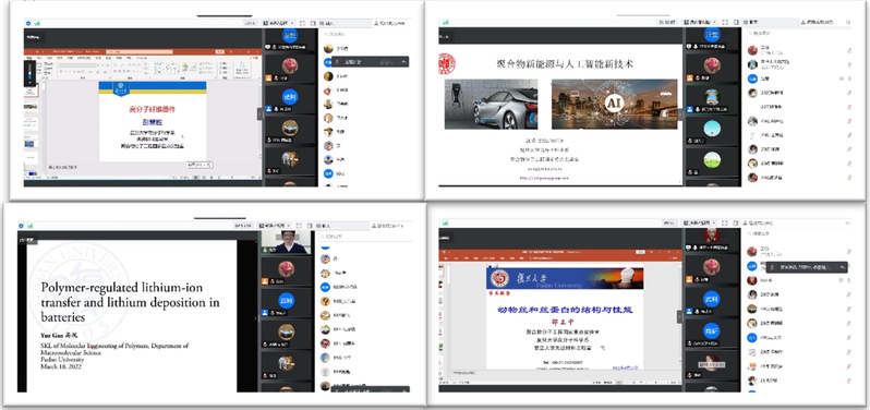 第一场报告会3月18日进行,由副系主任杨武利教授主持,报告人邀请了系主任彭慧胜教授、青年研究员陈茂和高悦老师。彭慧胜老师围绕“高分子纤维器件”这一主题,从纤维储能器件、纤维发光器件、纤维传感器等不同方面介绍了课题组乃至整个领域的研究成果。陈茂老师详细介绍了侧链含氟聚合物的可控合成方法,以及新型的主链含氟聚合物的反应体系。通过光氧化还原的方式,可以增加时空可控性,并使体系的耐受程度增加,减少金属催化剂的引入,使反应条件更加温和,因此是合成含氟聚合物的有效方法。高悦老师从锂离子电池的市场需求出发,强调了锂离子电池之于我们日常生活的重要性。为增加锂离子电池的稳定性和自身功能性,高悦老师及其课题组着重于调控锂枝晶的产生,并抑制过于活泼的反应。