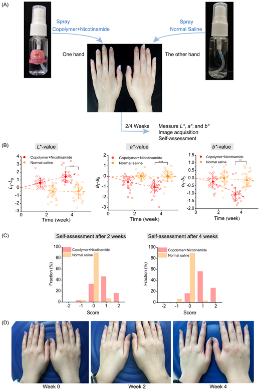 图4 热致水凝胶在人体皮肤上的首次人体研究。A) 试验研究过程;B) L*、a*和B *值在2周和4周时的测量值; C) 2周和4周的自我评价得分;D)使用共聚物+烟酰胺(左手)和对照 (右手)4周前后评估色素减退的代表性图像。误差条表示标准差(n = 30);“***”表示p < 0.001,具有显著差异。