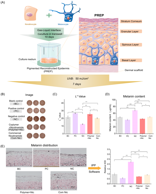 随后,利用人表皮角质形成细胞与黑素细胞在气液界面共培养得到的具有表皮结构的3D-皮肤色素重构模型(3D-PREP),验证了其功效,其美白效果优于一款商业化的烟酰胺面膜(图3)。