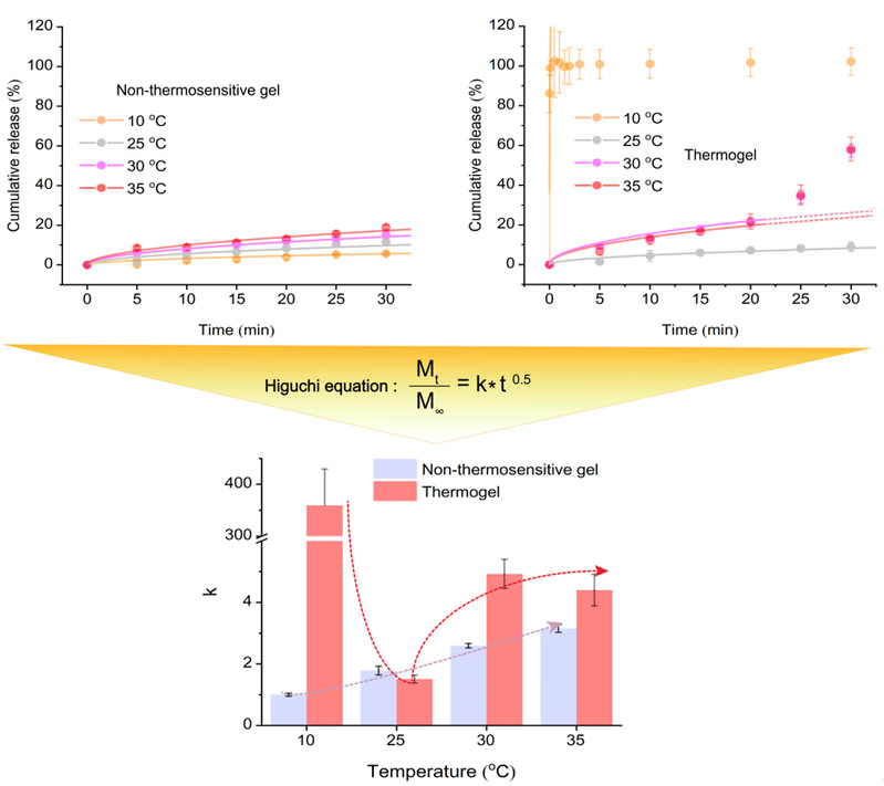图2 不同水凝胶在指定温度下烟酰胺的体外释放曲线。无温敏性凝胶(10 wt% PVA)和热致物理凝胶(10 wt% 共聚物)在不同温度时对烟酰胺(5 wt%)的累积释放,并由Higuchi方程拟合曲线。PVA体系由于没有相变,k值随温度升高而略有升高,而热致水凝胶(Thermogel)体系由于溶液-凝胶-沉淀相转变,k值先急剧下降后显著升高。
